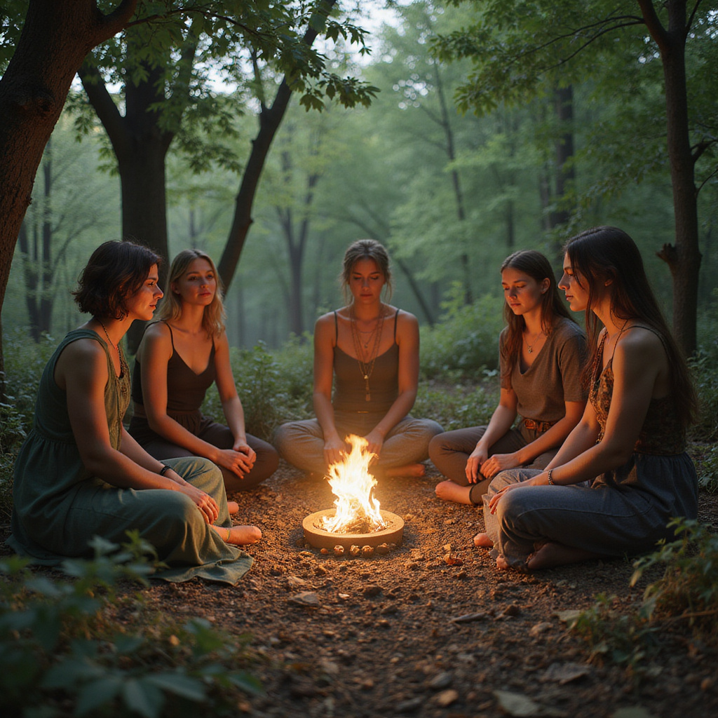 Trabalhamos com imagens naturais, de mulheres em rituais, que transmitem acolhimento, empoderamento e espiritualidade.